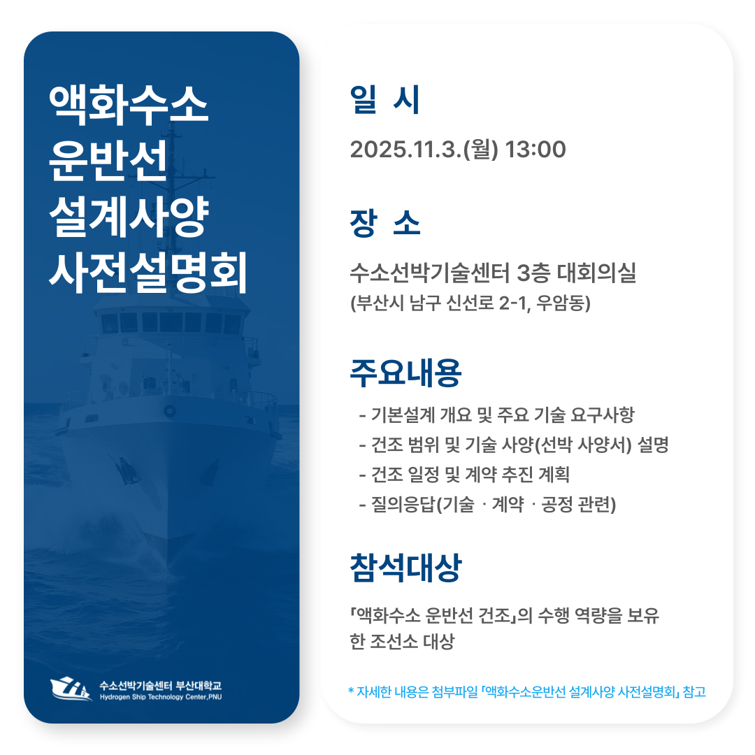fnctId=bbs,fnctNo=13158 액화수소운반선 설계사양 사전설명회 개최 안내 date 2025.10.24 name 관리자 e-mail view 30 첨부파일 액화수소운반선 설계사양 사전설명회.pdf 미리보기